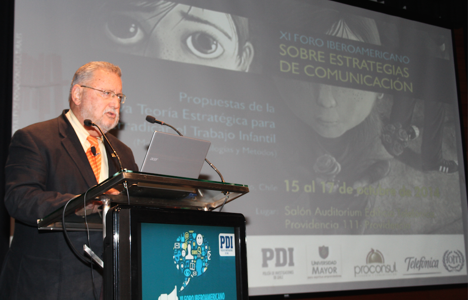 Captura de pantalla 2014-11-06 a la(s) 6.35.07 PMEl XI Foro Iberoamericano sobre Estrategias de Comunicación (FISEC), se celebró en Santiago de Chile entre los días 15 y 17 de octubre del 2014, siendo organizado en conjunto por la Universidad Mayor, la Policía de Investigaciones (PDI) y el capítulo local de FISEC. Este año se planteó el desafío de encarar una problemática aplicada, cual fue la del trabajo infantil.